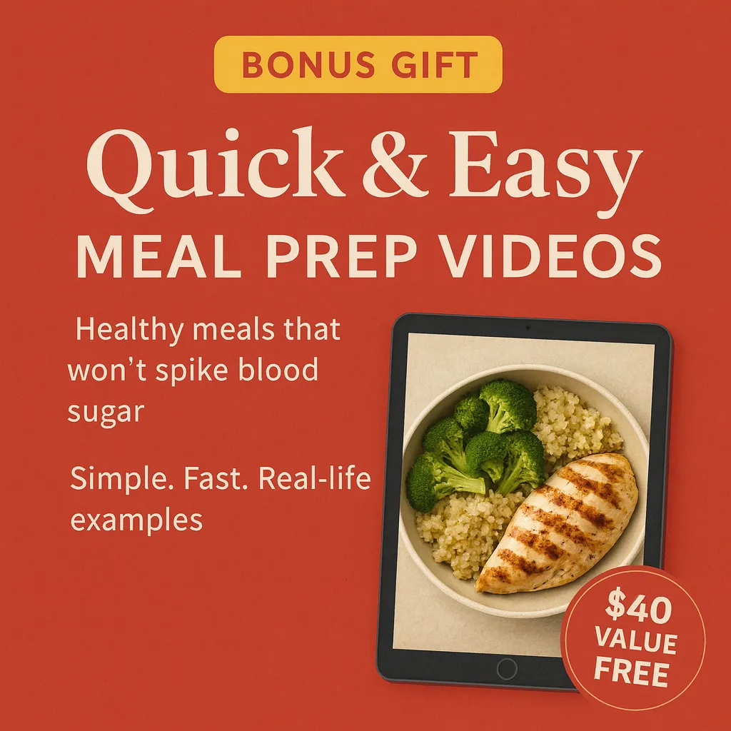 To make this even easier for you, I’ve added a bonus set of short videos showing you how to prep simple, delicious meals that won’t spike your blood sugar. These fast, real life examples help you stay consistent, save time, and feel confident about what to eat every day.